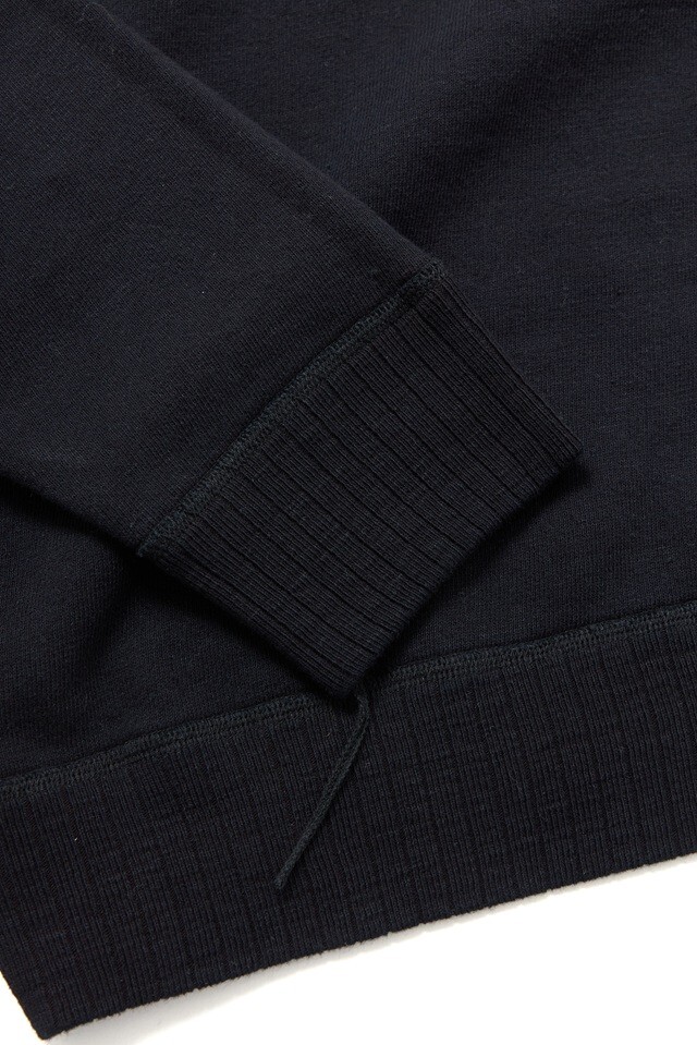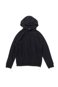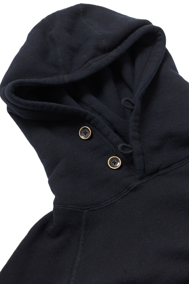 当社定番である先染めインディゴのフーディに、ブラックのオーバーダイを施した一着。