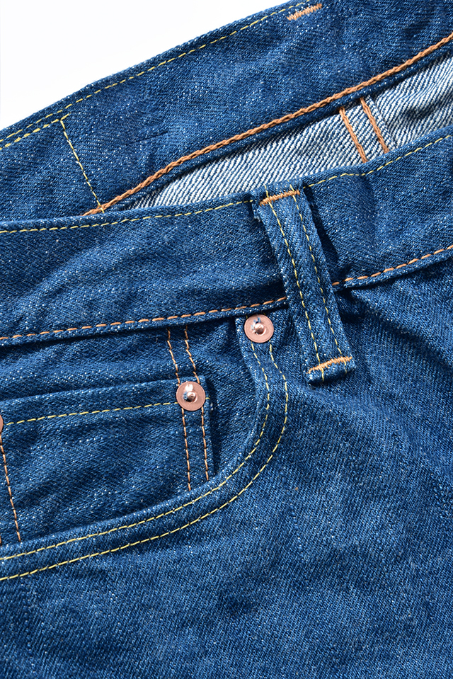 この独特な色を完成させるために、グリーン染料の配合を始め、インディゴの濃度の細かい調整等、試行錯誤を繰り返しました。是非、この当社のオリジナルカラーをお楽しみ下さい。