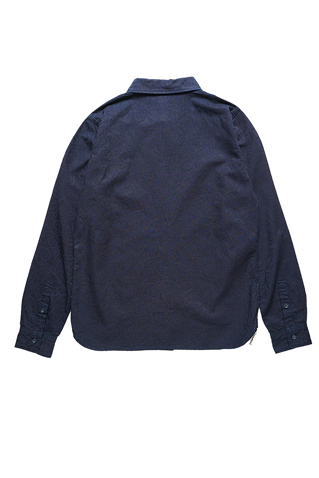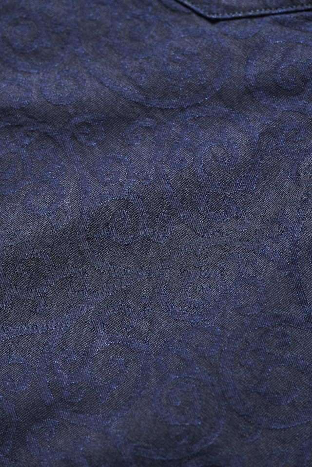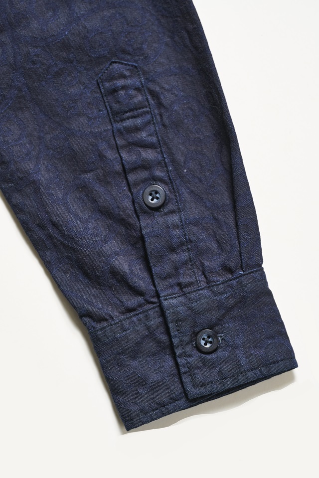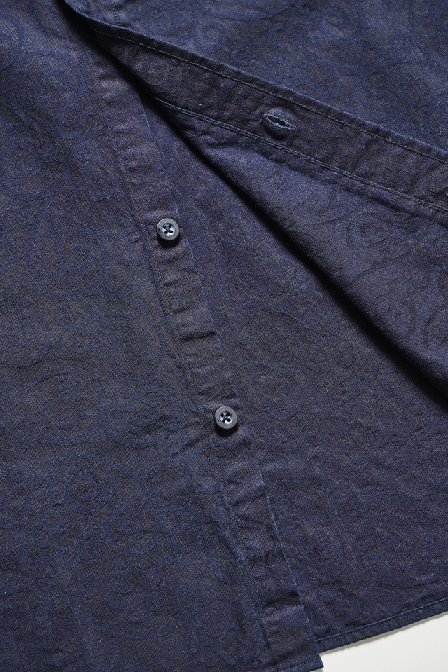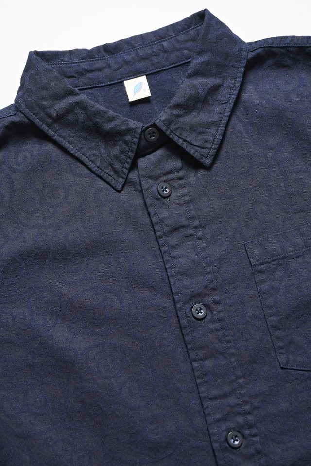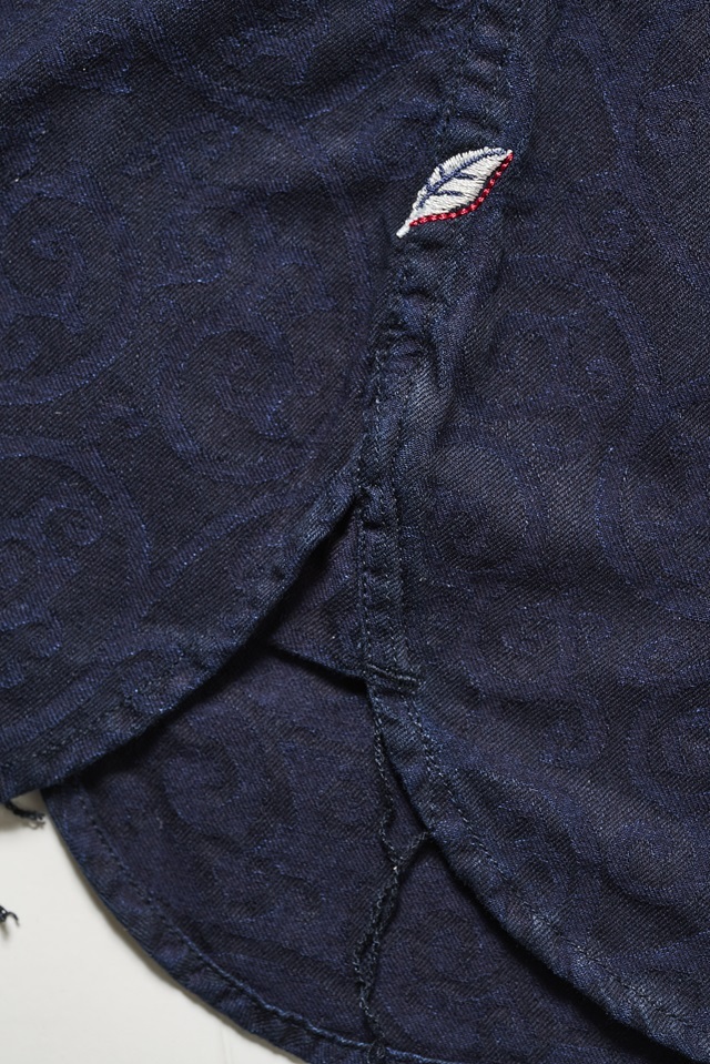 ベーシックな片胸ポケットインディゴシャツにアラベスク(唐草)柄を施しました。