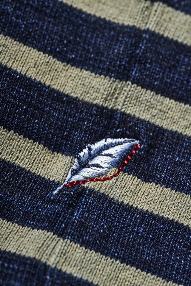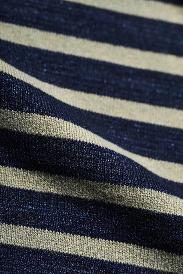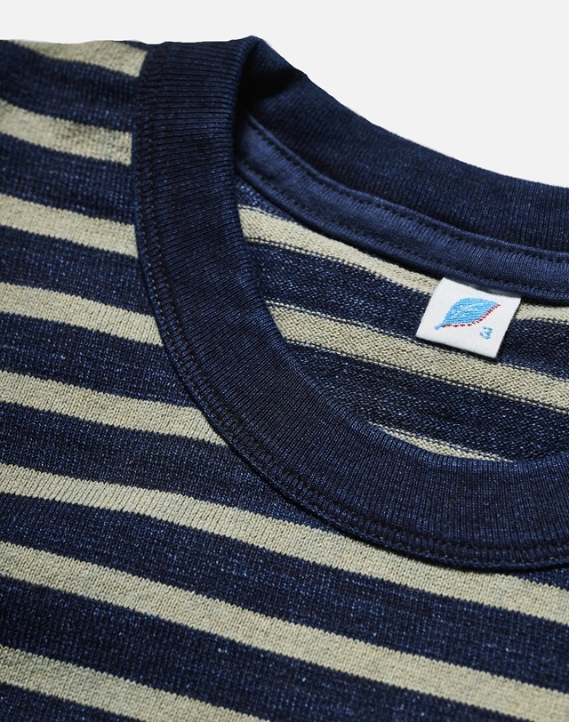 コットン100%のボーダークルーネック長袖Tシャツです。ネイビーの部分は先染めインディゴ糸を使用しており、着用と洗濯を重ねることでインディゴが徐々に退色し、生地の奥行や風合いを楽しむことが出来ます。また肉厚な生地なので、型崩れし辛いのも嬉しいところ。